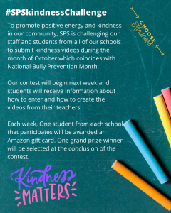 To promote positive energy and kindness in our community, SPS is challenging our staff and students from all of our schools to submit kindness videos during the month of October…
