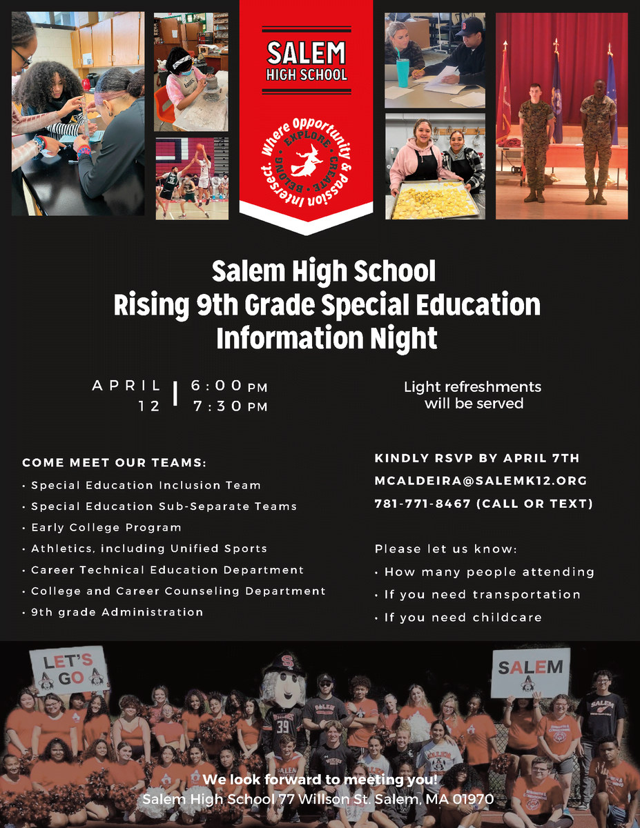 Current grade 8 students and families are invited to SHS’ Special Education Information Night on April 12th from 6-7:30. Come meet SHS staff and learn about programming. More information can be found using these links. English / Spanish / Portuguese