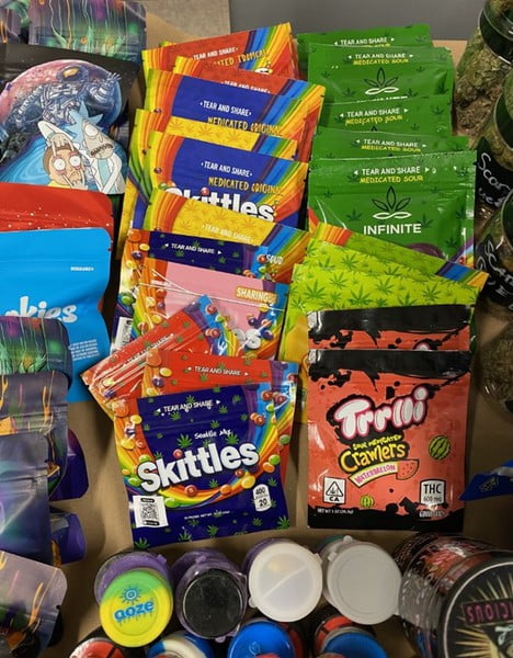 On Thursday, December 1st, detectives assigned to the SPD Criminal Investigation Division served an arrest and search warrant, resulting in the seizure of significant amounts of marijuana, THC products, psychedelic mushrooms, US currency, and drug paraphernalia. Many edible THC products were contained in packaging resembling candy with bright colors and cartoon-like characters. Some were even labeled as “Skittles” and “Starbuds” and looked almost identical to what would be found in any variety store. Individuals, students, parents, and schools should be aware that products containing marijuana or THC may be packaged in ways that could pass as normal candy or other foods.