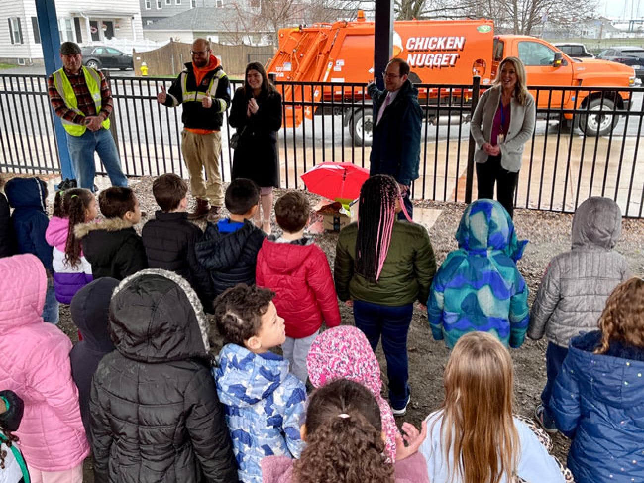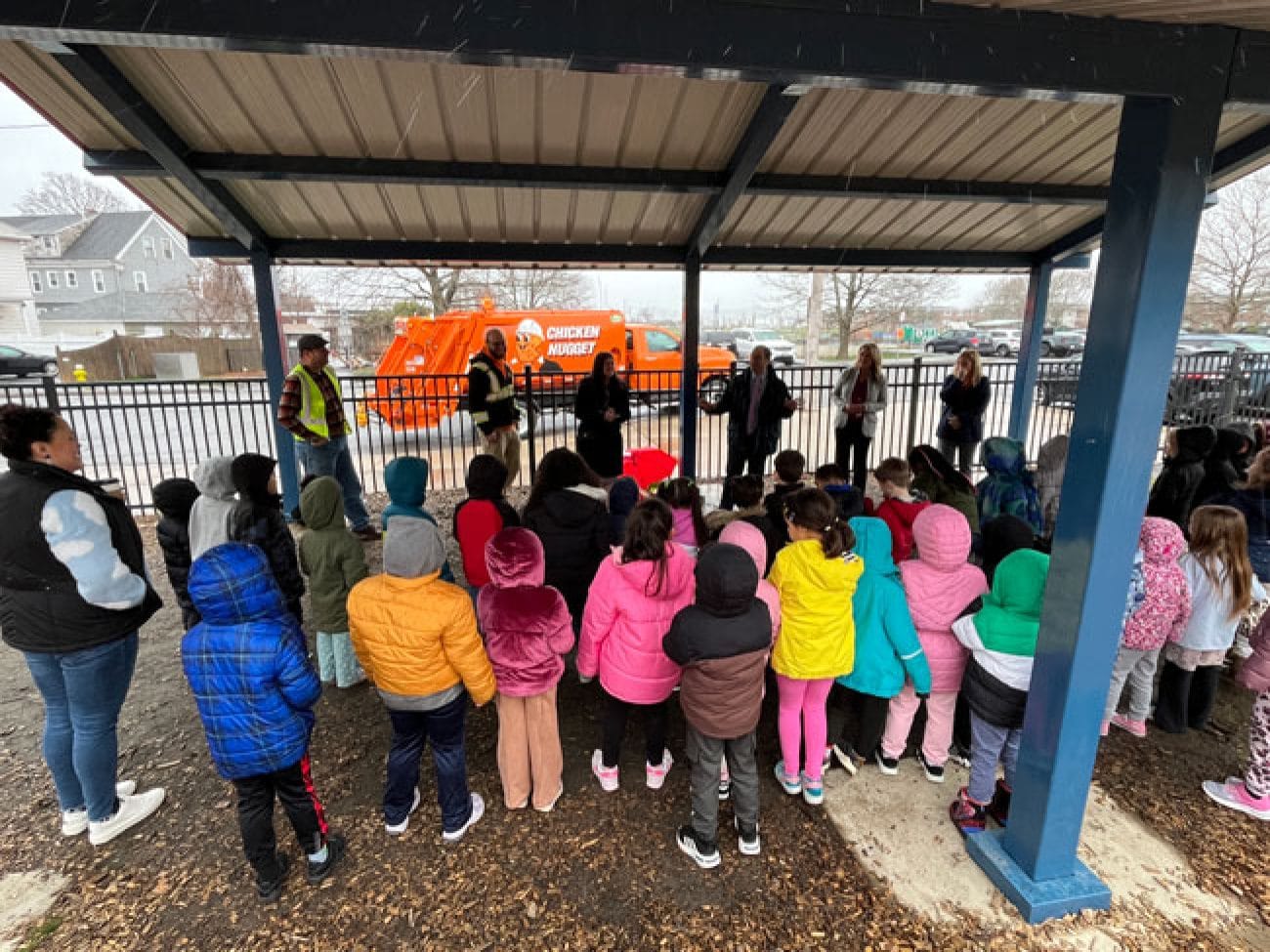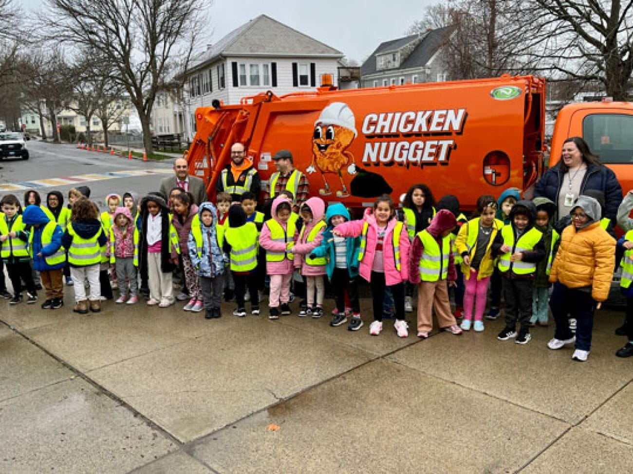 Mayor Dominick Pangallo and the City of Salem this morning unveiled the latest addition to the City’s Department of Public Services fleet. Outside the Saltonstall School, the kindergarteners who submitted the name for consideration were on-hand to christen Chicken Nugget, the City’s newest garbage truck.