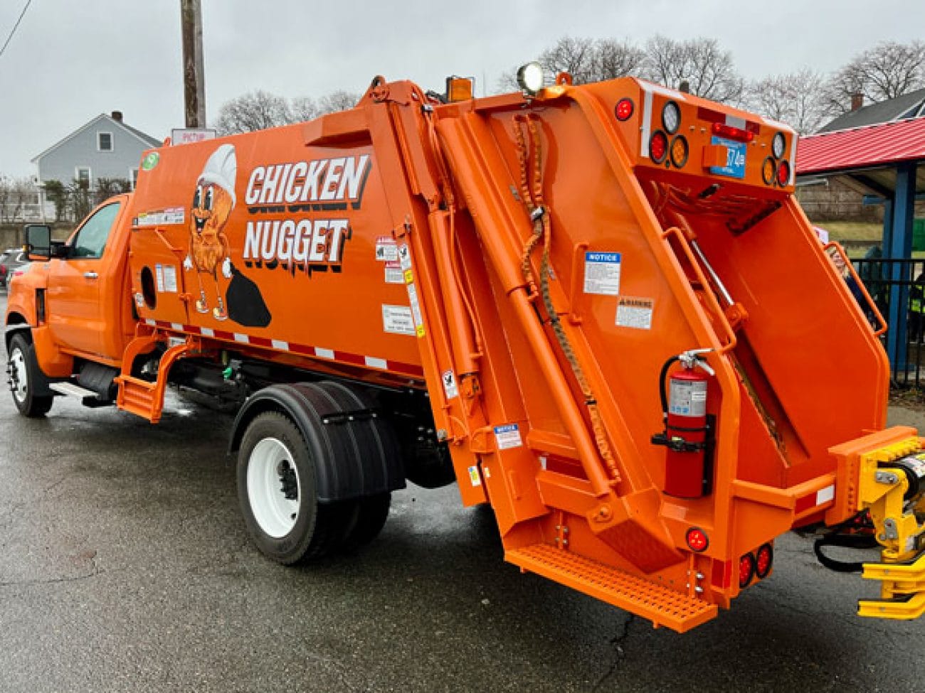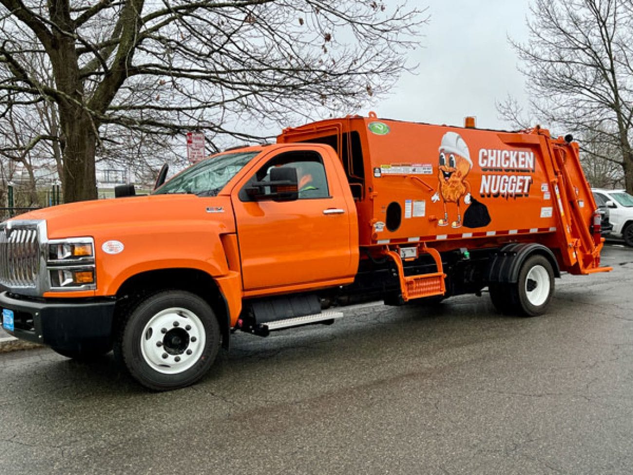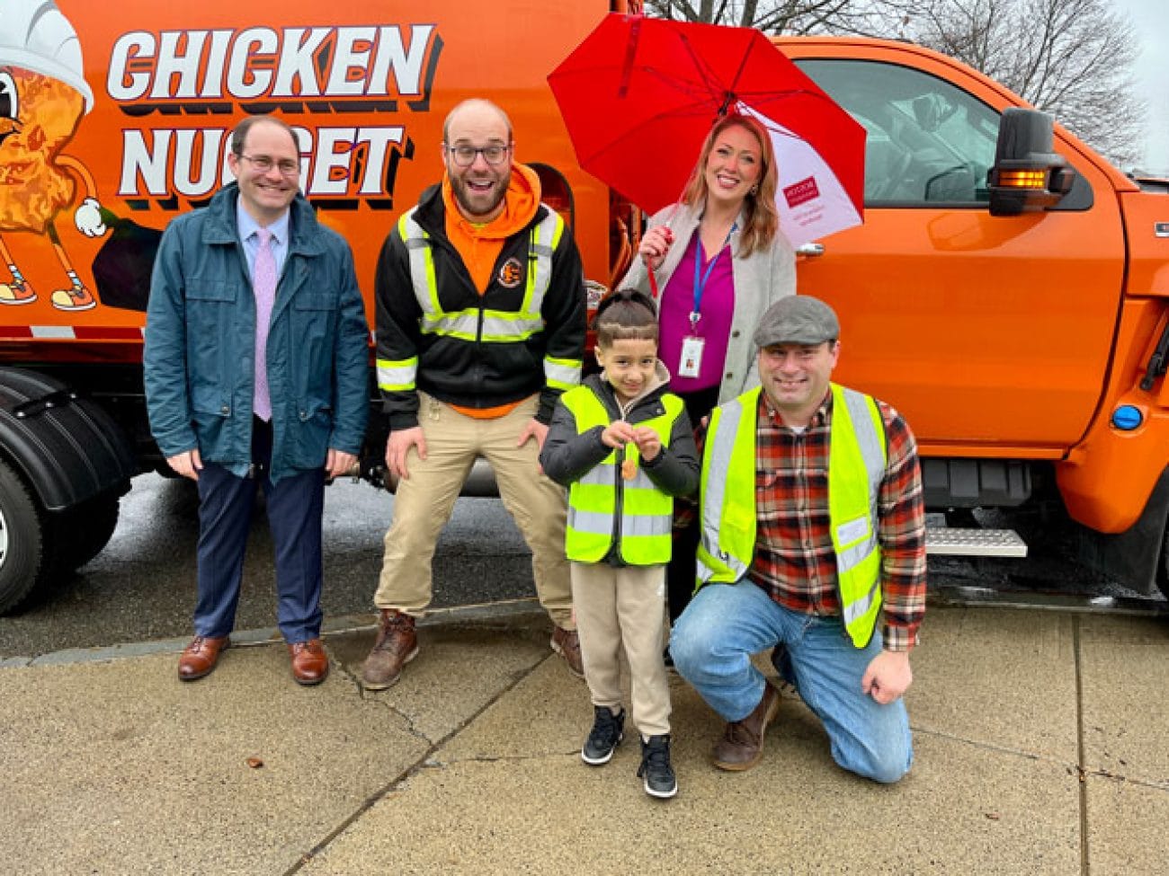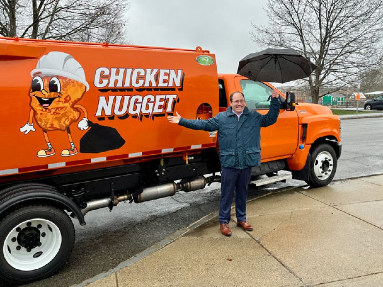 Mayor Dominick Pangallo and the City of Salem this morning unveiled the latest addition to the City’s Department of Public Services fleet. Outside the Saltonstall School, the kindergarteners who submitted the name for consideration were on-hand to christen Chicken Nugget, the City’s newest garbage truck.