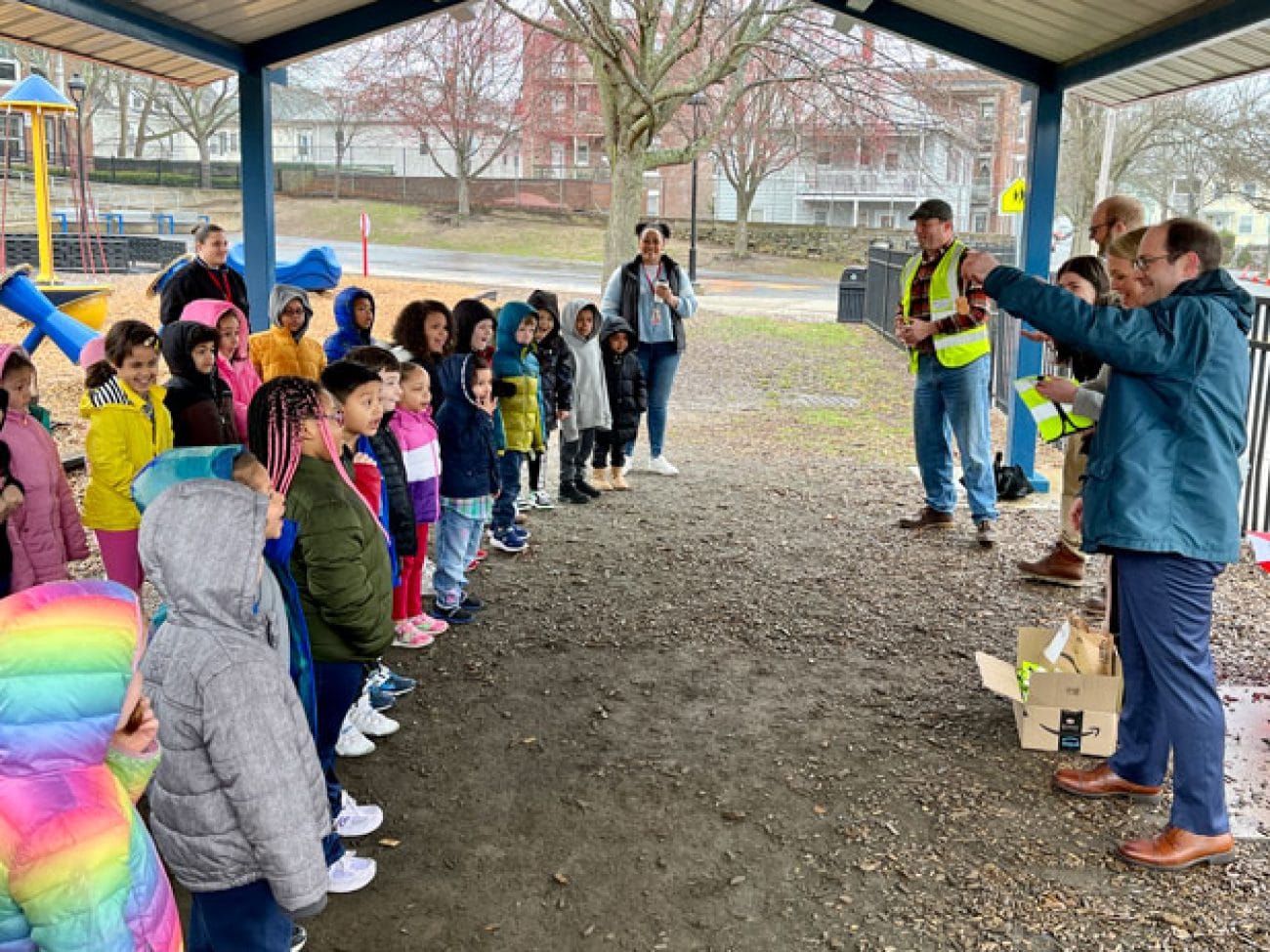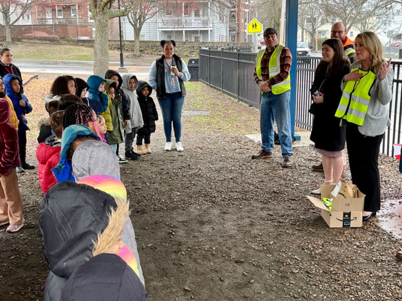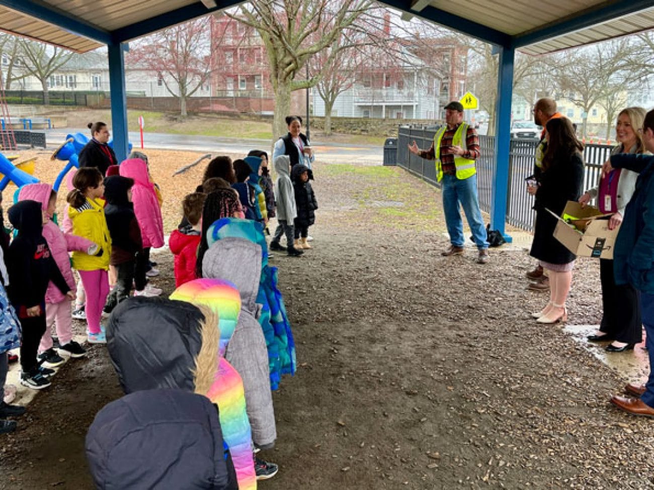 The winning entry, Chicken Nugget, was submitted by Mrs. Catherine Corriveau’s kindergarten class at Saltonstall School, and specifically by kindergarten student Elian Soto-Villanueva. At this morning’s unveiling, students were presented with yellow safety vests and chicken nugget shaped keychains by DPS Director Ray Jodoin (Salem High School Class of 1997), as well as hearty congratulations and thanks from Mayor Pangallo.
